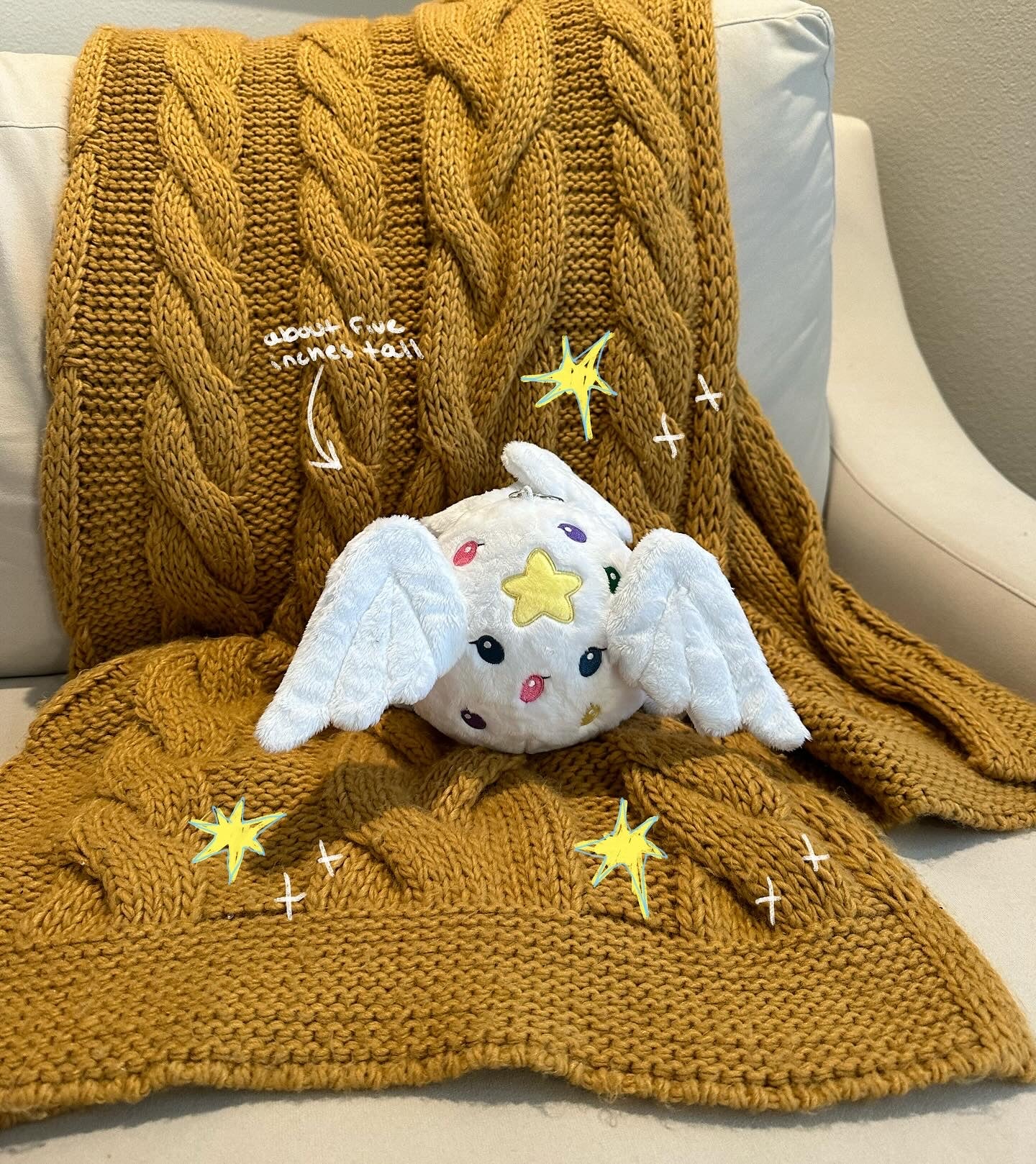 she is 5 inches tall and 7 inches across due to her wings 🪽